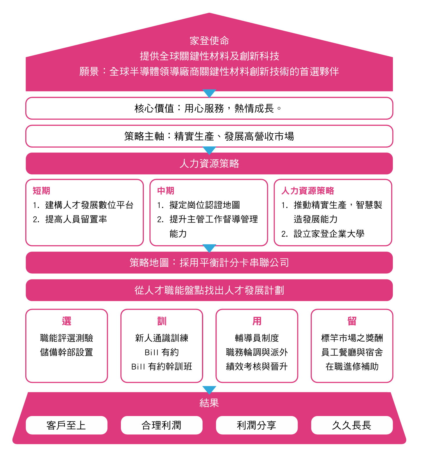 秉持以人為本的理念,家登精密致力於透過「創新培育」的模式,營造有利人才成長與發揮的企業文化,培育出「用心服務、熱情成長」的家登人。除年度整體人資策略外,各部門每年亦依業務發展與職能需求,提出專屬的教育訓練計畫並編列預算,建構制度化的人才培育機制。