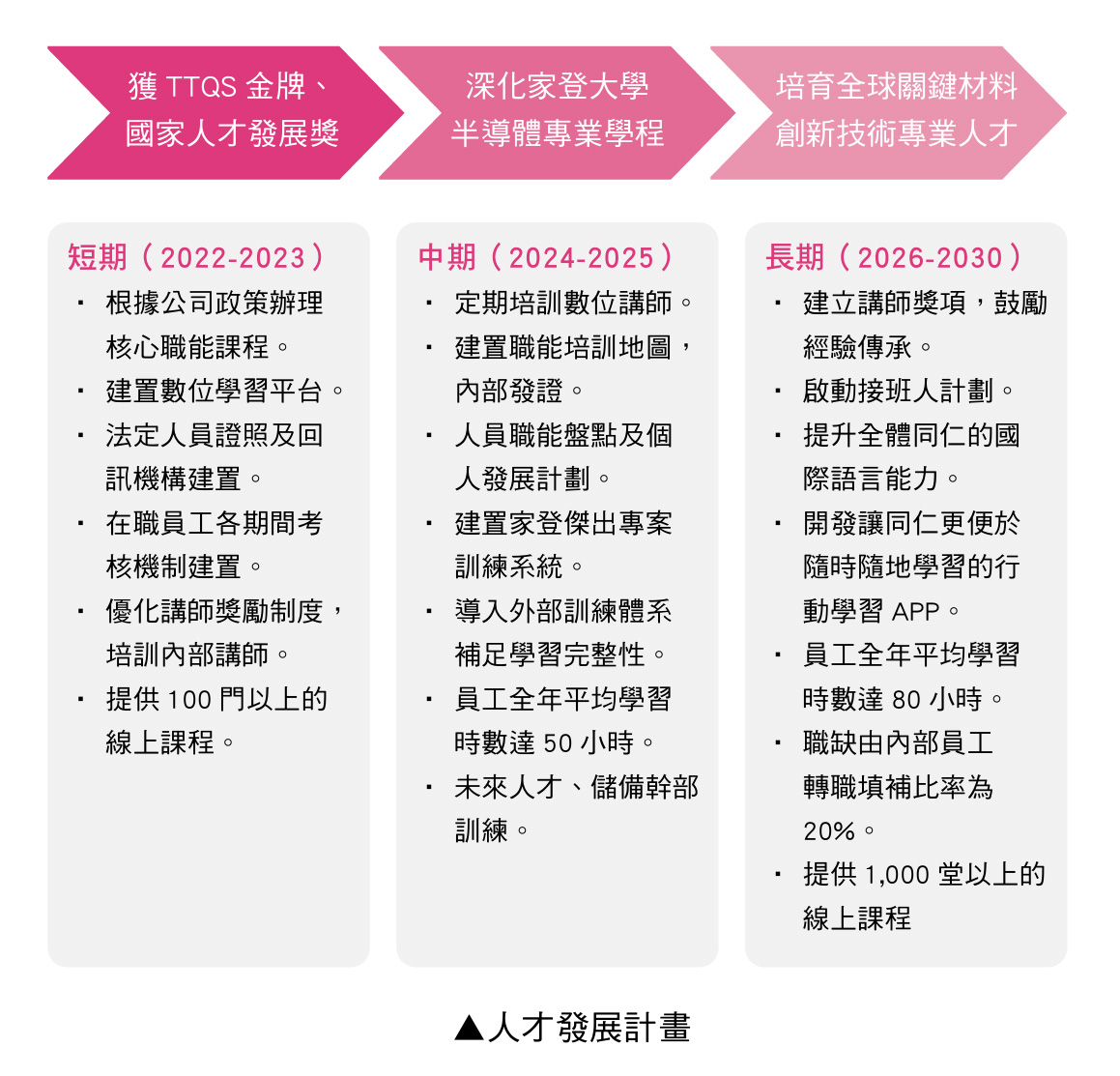 整體人才發展策略主軸源自定期執行的部門訓練需求調查與職能落差分析,據此規劃並實施多元學習活動與人才育成專案。具體包括:「Bill有約/ABC&BSC高階管理幹訓班」、「家登大學職能培訓專案」、「LMS 數位學習系統」、「登峰造極MA(儲備幹部)培訓專案」、「中原產學合作案」、「DMAIC 問題分析與 QCC 品管圈」,以及「晉升職能認證專案」等,藉此系統性強化員工專業能力,培育組織未來關鍵人才。