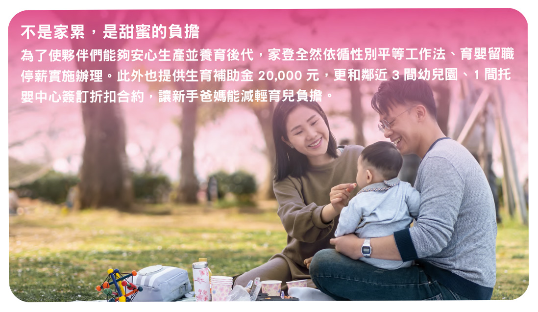 這些年每一位家登人的付出激發的成效,使得營收屢屢創新高,董事長與總經理感念所有夥伴的努力,在2021年設定全新員工福利制度;啟動家登人成家計畫,承諾員工在家登的屋簷下,只要努力就可以吃得到『豕肉』,就能擁有財富,近年特別於台南、台北投入數億資金購入建地,規劃完善福利設施,展開興建計畫,期望讓所有的家登人都可以成家立業,只要符合一定條件的家登員工,就可以用低於市價的價格買到房子,且不需事前繳交任何費用,直至交屋後再支付建置成本費用,以低於市價成本讓每位家登人都有屬於自己的家,屬於自己的家庭、勇往直前挑戰高額獎酬的動力,而挑戰創新帶來的收益會分享給帶來價值的關鍵人才,這是公司最重要的信念。家登成家計畫