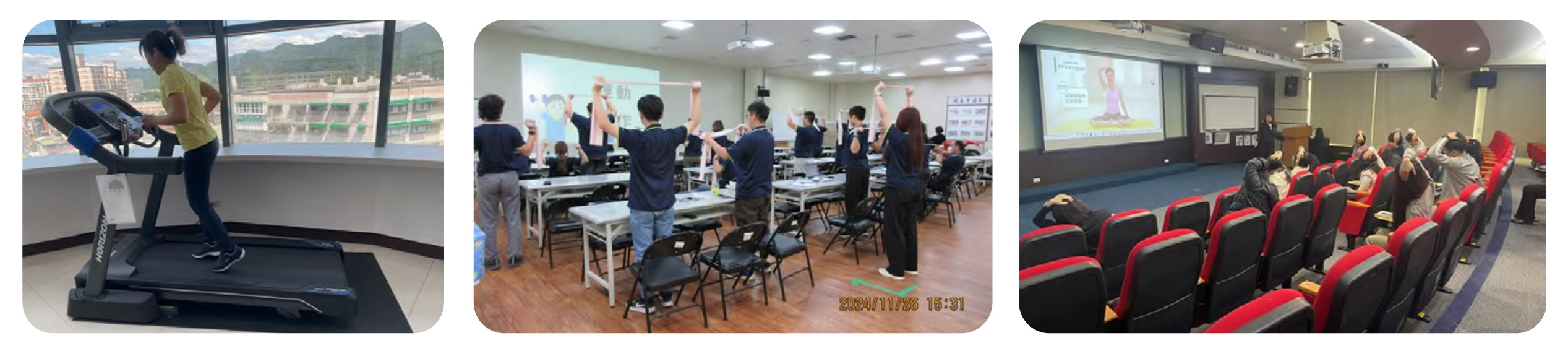 提供健身設施支持員工日常運動:於員工餐廳設置健身器材(如跑步機、飛輪車、登步機與重訓設備等),供員工於下班時間彈性使用,以紓解壓力、維持體能與提升整體健康。