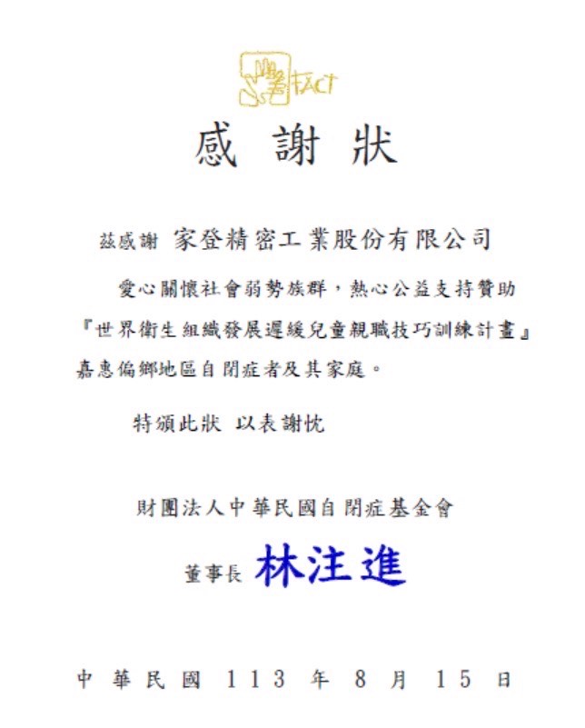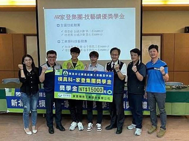 新北高工是董事長邱銘乾先生的母校,董事長感念母校栽培,為母校的發展貢獻一份心力;因此特別設立模具科獎學金,期待年輕學子們持續鑽研專業技術,協助潛力學子們能夠不斷追求技術的創新與精進,以實際的行動來支持技職教育。家登精密深信技術人才是半導體產業得以持續發展的核心動力;由此展現家登精密與在地教育體系強化連結的決心。此外,更為新北高工技能競賽選手訂製團隊制服,提升選手自身信心、凝固團隊向心力,藉此培養學子們對於學校的歸屬感,進一步激發自我突破的毅力與為校爭光的企圖心,選手們渴望成功的野心與家登精密的企業文化如出一轍——勇於挑戰、敢與創新,未來也將持續在教育界投入資源,以達產學共榮之願景。