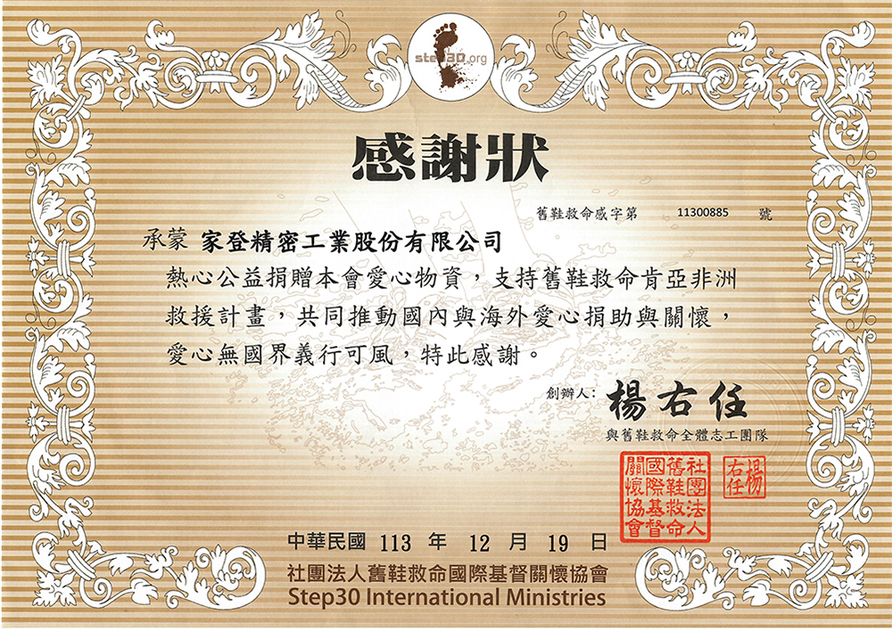 多年來家登精密在董事長與副董事長的帶領之下,始終謹記回饋社會的企業責任,在公益活動上未曾缺席,秉持著「用心服務,熱情成長」的核心理念、配合聯合國永續發展目標(SDGs),評估並實踐社會服務行動;為了能更有效的評估投入的資源與追蹤效益成果,參考商業社會影響力框架(Business forSocietal Impact, B4SI),藉由將投入的時間、金錢與物品進行量化,以利分析且了解各項公益活動所投入的資源,及其所帶來的整體效益。