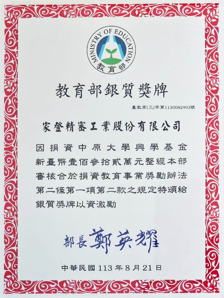 2024 年度贊助中原大學機械系專題實作基金,本基金用於支持學生們進行專題實作與競賽活動。家登精密期許以實作基金作為橋樑,持續深化產學合作,以培育新世代機械人才,給予學生們在理論知識與技術應用間,結合理論與實作的最佳平台;協助學生們了解產業需求並加快與產業接軌,縮短教育與實務間的落差,打造具備專業素養的產業即戰力。