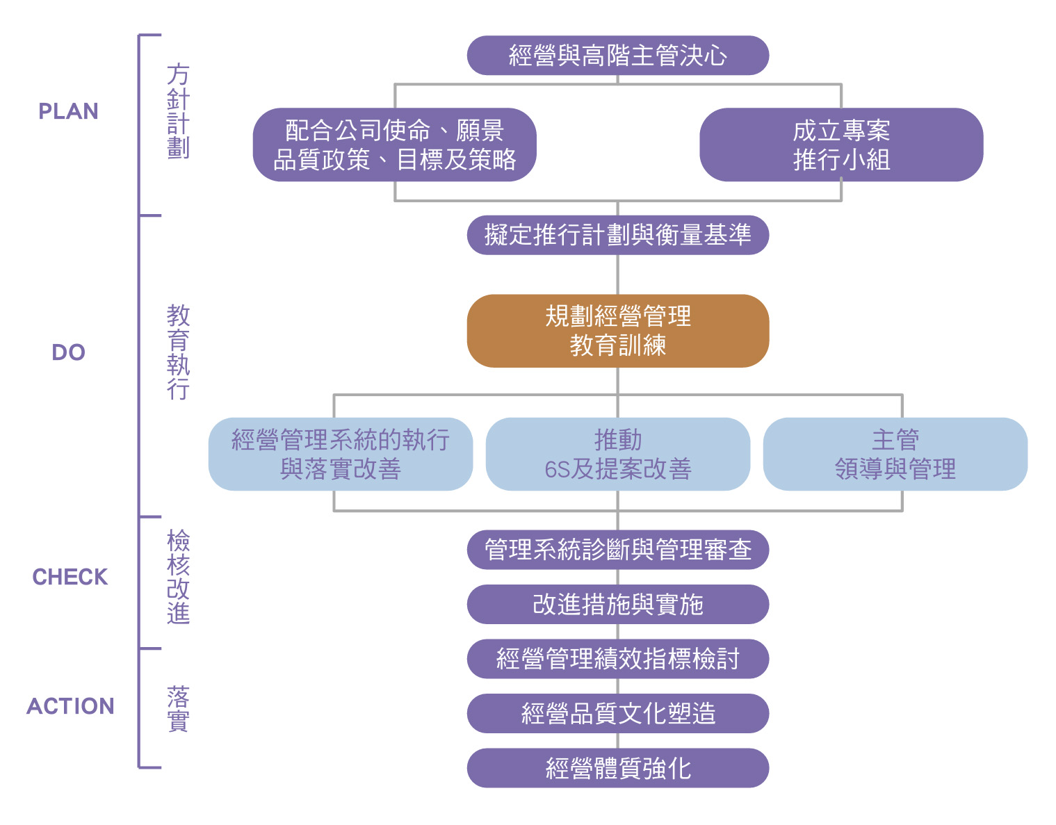 家登精密經營團隊高度重視品質管理,致力於建立系統化、全面性的品質管理架構,以回應各類利害關係人對產品與服務品質的期待。公司制定品質管理藍圖,並將品質理念融入日常營運流程與決策系統中,全面推動品質文化向下扎根。透過日常管理要項的落實,導入PDCA(Plan-Do-Check-Act)循環機制,強化全員參與及持續改善,追求品質、產能與成本效益的最佳經營效果。公司堅信「先有品質,方能有效率」,優異的品質是產銷體系與成本管理的基礎,亦是實現永續競爭力的核心。