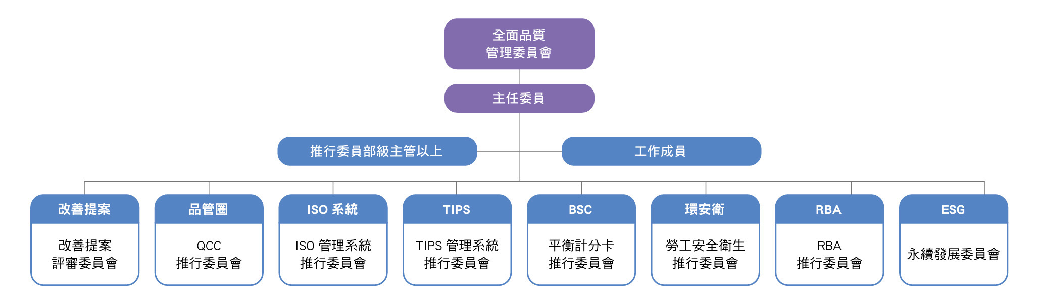 家登精密經營團隊對品質管理展現堅定決心,設立「全面品質管理委員會(TQM Committee)」作為統籌推動與規劃的治理單位,確保品質策略與企業營運高度整合。委員會主導各項品質與管理系統之推行,涵蓋:改善提案活動、QCC品管圈、ISO管理系統、TIPS管理系統、平衡計分卡(Balanced Scorecard, BSC)、勞工安全衛生推行委員會與RBA推行委員會;透過上述機制,推動「全面品質、全員參與」的管理目標,落實組織各層級對品質與永續責任的承諾,強化持續改善文化,邁向高績效與永續經營。