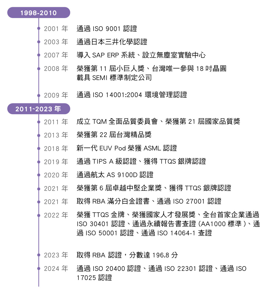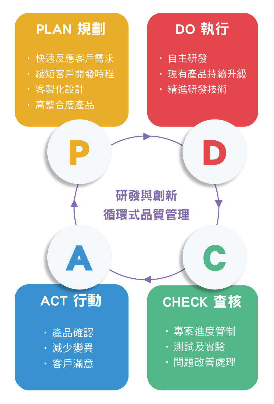 建立相關品質活動並將組織意志推向客戶需求滿意第一,組織成長的過程中持續進行PDCA逐步改善茁壯,朝著成為產業領航者為目標,將本身的優點提出奉獻,提升產業共體共榮,為台灣的半導體產業鏈奉獻一份心力。