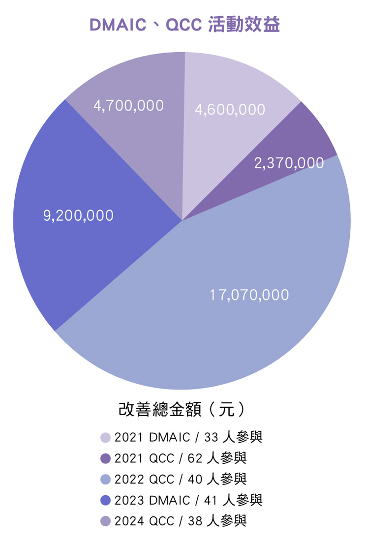 家登精密自2021年起,開設QCC(品管圈)及DMAIC(定義、衡量、分析、改善、控制)專案,導入分析實務工具,結合統計分析方法與品質管理工具,強化問題解析與流程優化能力。透過實務應用於檢定方法及實驗設計(Design of Experiments, DOE),有效找出最佳製程參數,達成輸出最佳化目標。專案成果亦制度化納入作業標準程序,落實改善成效,並推動標準化管理,持續強化品質穩定性與營運效率。2024年共38個學員參與QCC活動,期間專案效益金額470萬元。 DMAIC、QCC活動參與普及率