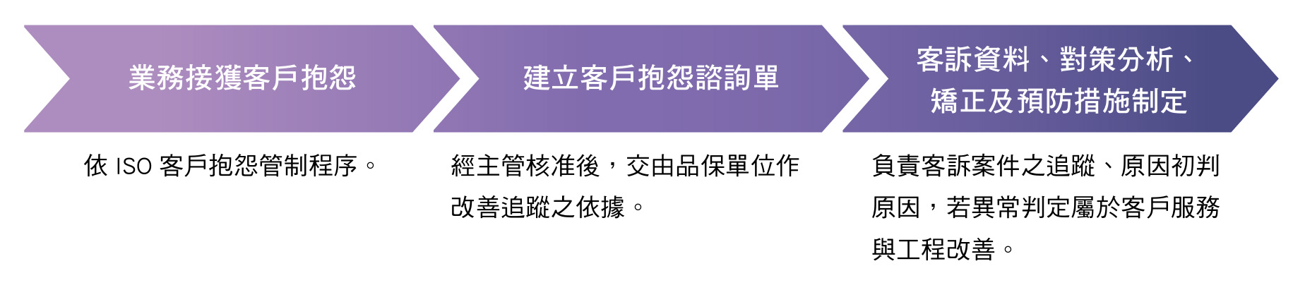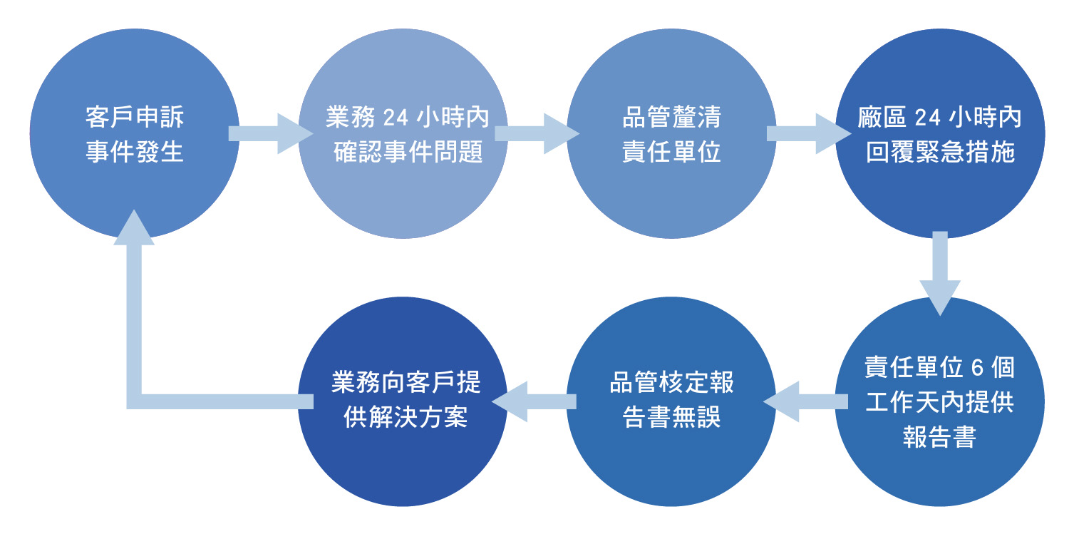 業務單位:需於24小時內與客戶聯繫且確認實際問題狀況,並填寫客戶抱怨諮詢單傳遞至品保單位。