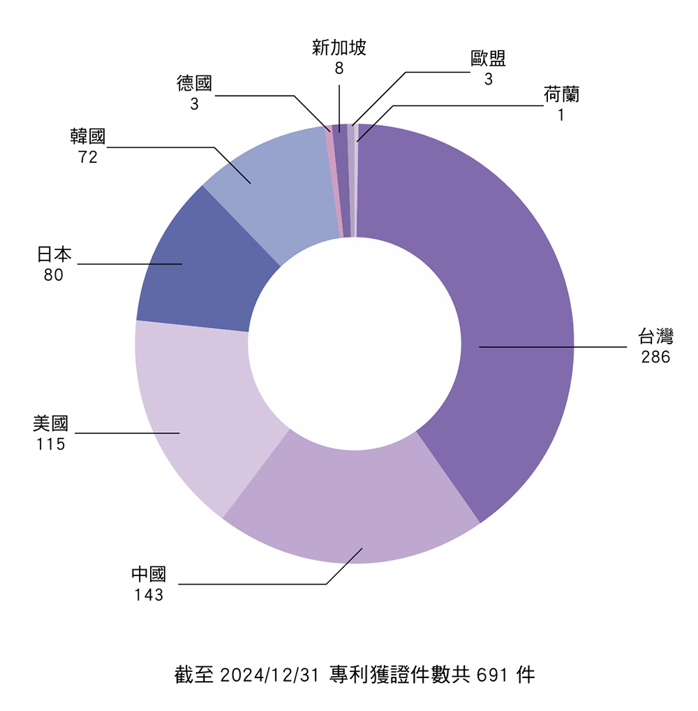 全面性專利佈局是家登精密保持技術領先的競爭基石,至2024年底共取得691件專利,尚有215件專利申請中,2024年獲證件數有67件,專利佈局範圍橫跨全球。為了以系統化的方式進行智慧財產資產管理,家登精密自2009年起正式導入《台灣智慧財產管理規範(Taiwan Intellectual Property Management System, TIPS)》,並且積極佈局智慧財產版圖、強化專利系統建置與專利版圖防禦能力,顯現智慧財產的重視、持續拓展建構完整的技術保護版圖,更建立其他大廠無法以規模取勝的高技術層次產業地位。