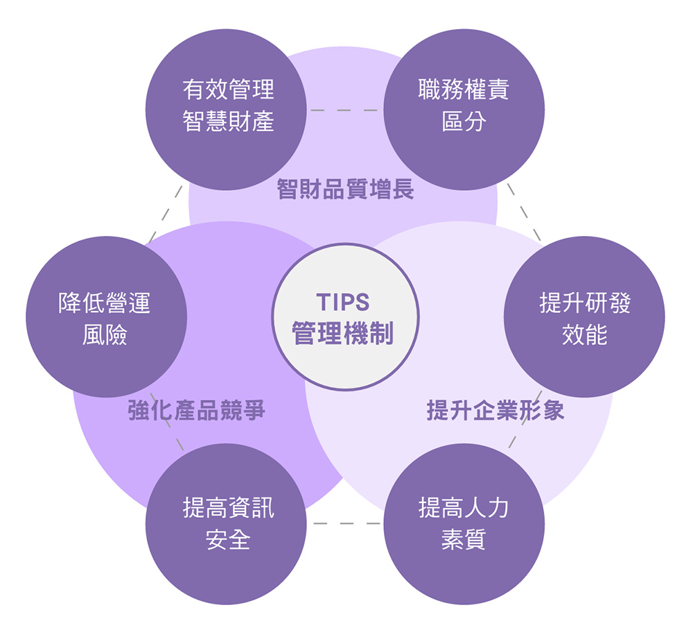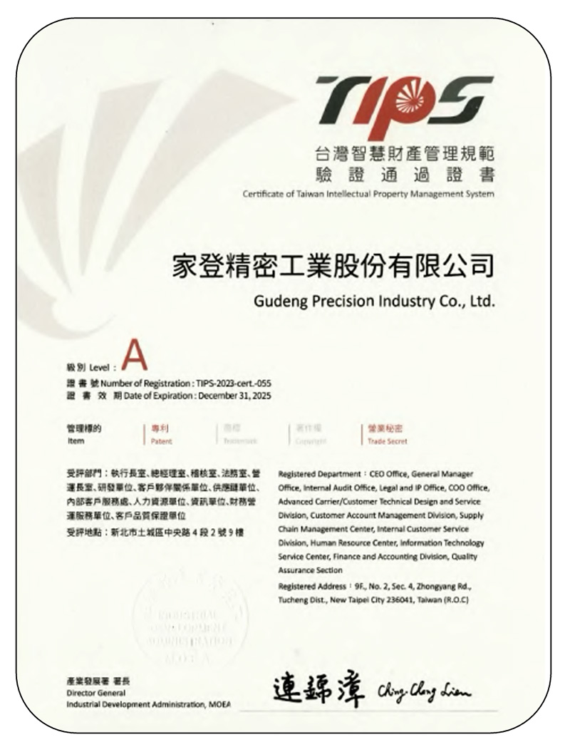 TIPS認證執行與通過2019 年通過TIPS A級認證,此乃家登精密在智慧財產制度建構、整體管理流程等各面向之肯定,近來更持續深化在數位化管理機制,且積極完善營業秘密保護機制,透過更緊密的跨部門合作,逐步朝向TIPS更高等級認證邁進,以此構築更完善並具韌性的智慧財產管理體系,以符合永續經營的企業願景。
