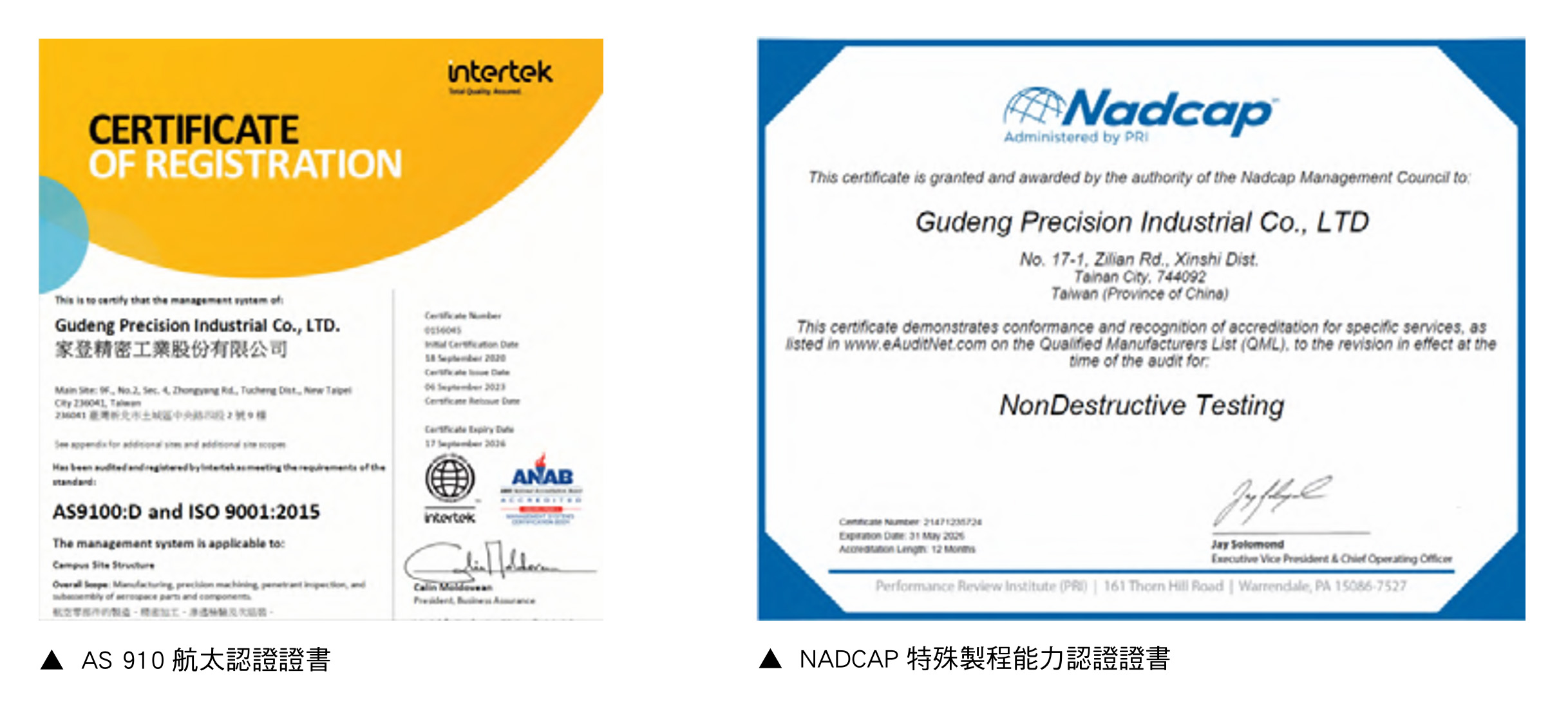 自2020年正式跨足航太領域,憑藉過往於半導體產業所累積的高精密製造經驗,延伸應用至對安全性、嚴謹性與可追溯性要求極高的航空飛行載具金屬精密加工,以及具阻燃特性的塑膠射出成型產品之製造;此乃家登精密兩大核心能力的跨域整合與深化應用的具體展現。為奠定深耕航太領域的基石,在2020年成功取得AS 9100航太品質管理系統認證後,並於2023年獲得NADCAP特殊製程能力認證,全面強化品質控管與製程穩定性;獲得這些國際認證不僅僅是對家登精密在製程與品質掌控能力的肯定,更是在航太領域長期深耕的最佳決心與佐證。